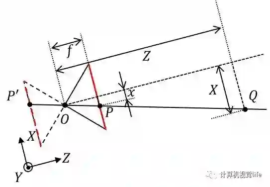 CCD标号坐标系原点到光轴的偏移量为 (单位:像素)。根据相似三角形关系,可以得出: