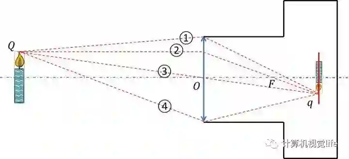 的位置,现在我们对「相机拍摄到清晰的蜡烛燃烧场景的草图」同样用作图法,只考虑
