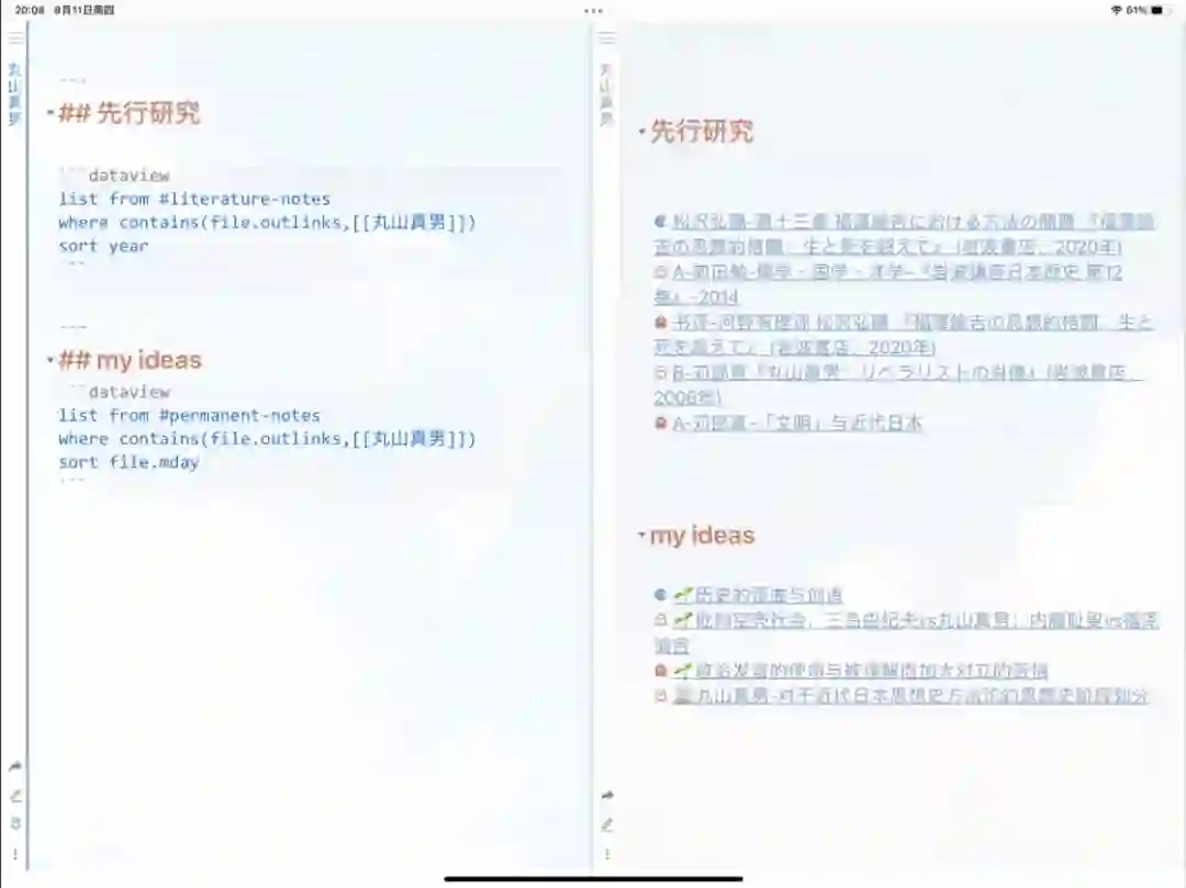 我在「丸山真男」这个条目里,写了左边的代码。上面的会帮我自动查找所有标有链接到这个文件的 literature notes ,并将他们视为言及丸山真男的先行研究。下面的则是查找链接到这个文件的 permanent notes,并将他们视为我关于丸山所做的永久笔记。