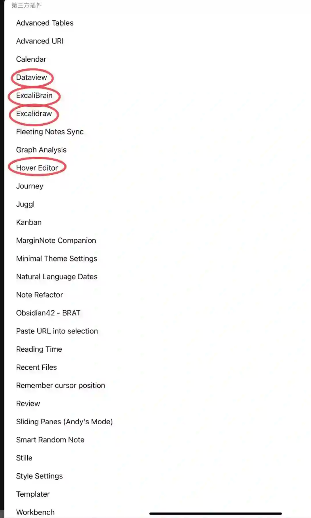 说到插件,则不得不提一提 Obsidian 中的各种强大插件。我个人安装了不少插件,要说起对学术研究最有帮助的,应该是画圈的这几个。