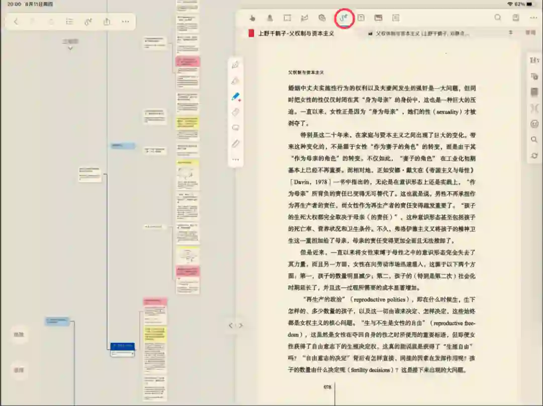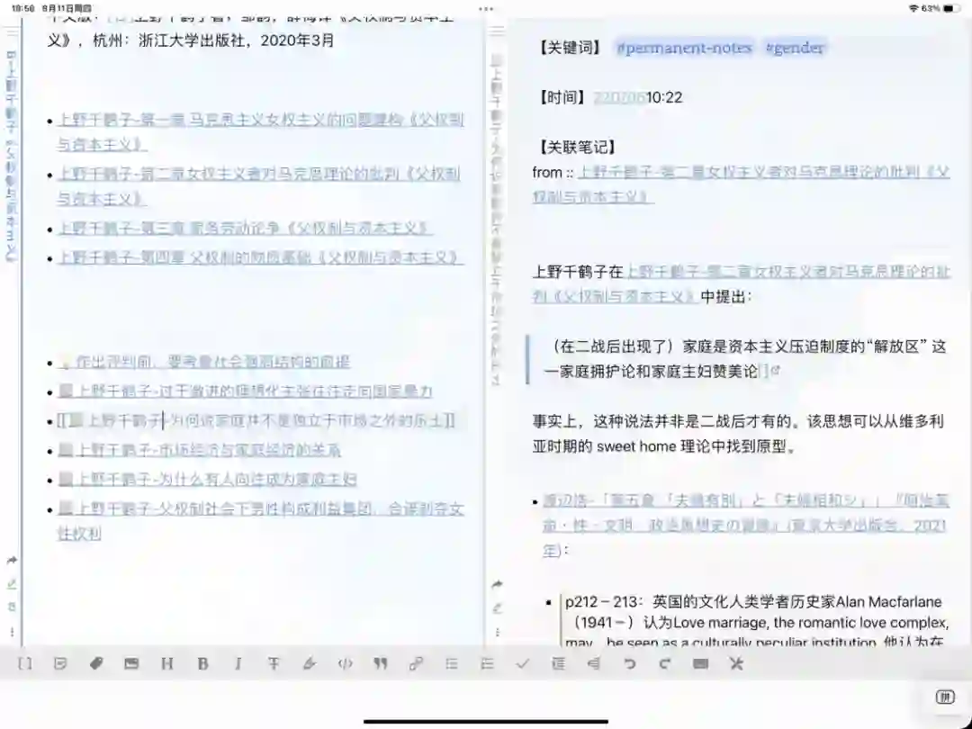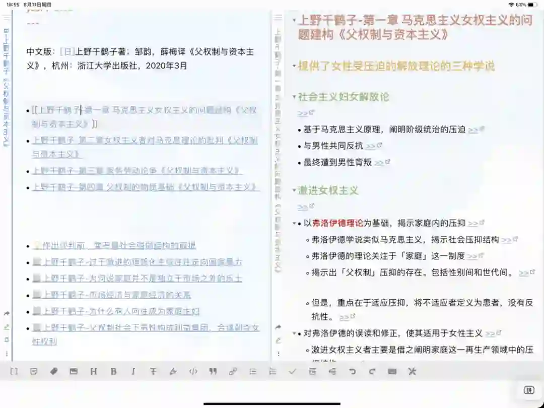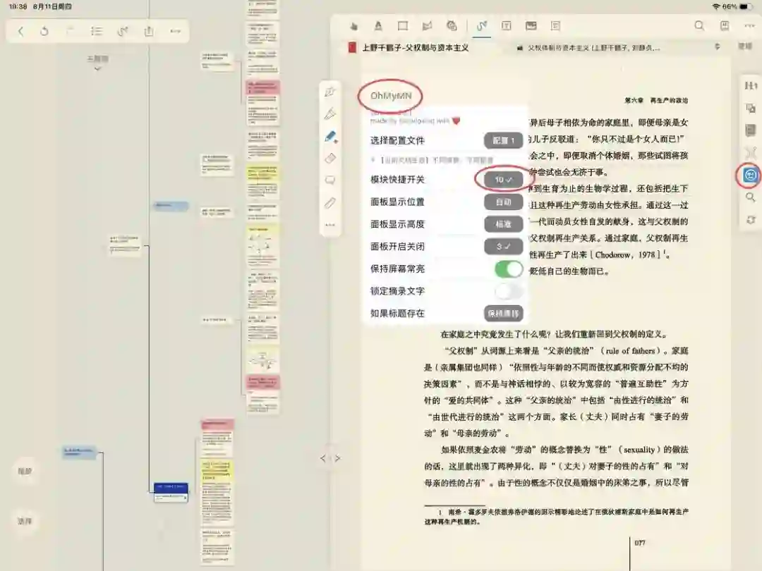 当大致浏览过发现要读的是一本逻辑结构完整,且体量不小的书籍时(譬如我最近正在读的是上野千鹤子的《父权制与资本主义》),我最常依赖的工具就是 MarginNote 3。关于这个工具,你几乎可以在所有地方找到使用教程,我无意再加赘述。我只说说我用起来得心应手的两个插件和我的使用方法。