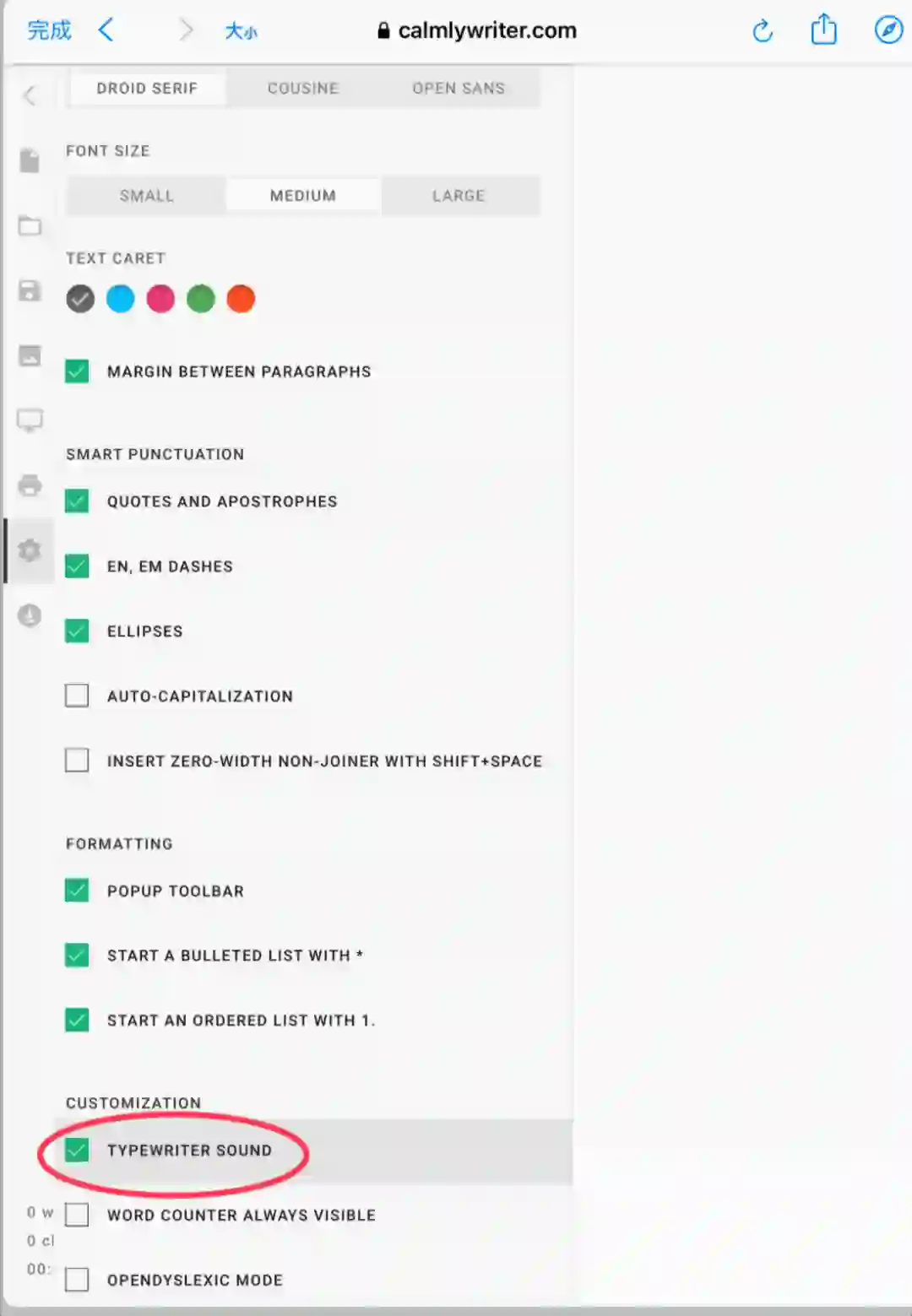 我最喜欢的就是在设置里可以打开 typewriter sound,就是每打一个字,就会发出老式打字机的键盘声,换行还会叮的一声,似乎在庆祝你又写完了一段。很小的功能,就是让人很开心。而且字体我也很喜欢。