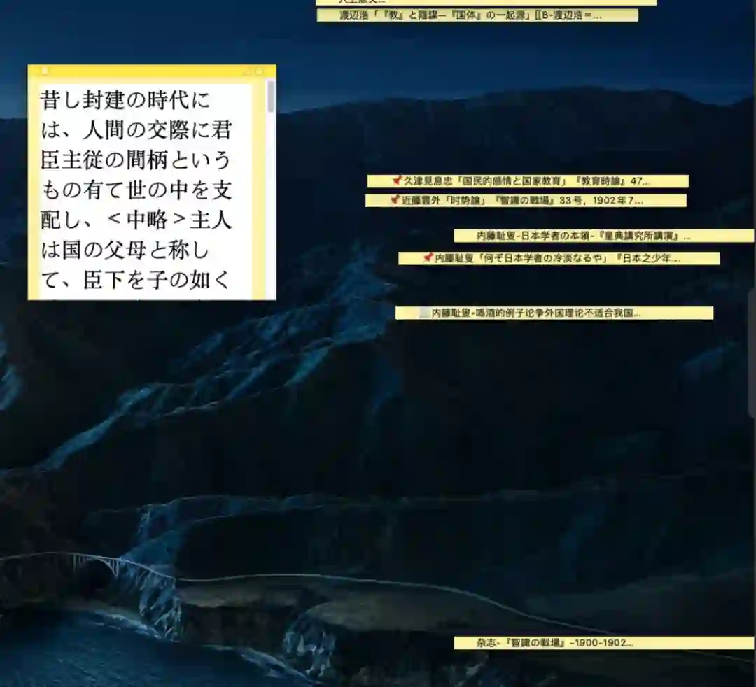 便签这个东西是电脑自带的。我发现在收集论文点子的时候,往往会出现这样的场景。譬如在 Obsidian 中任意浏览,发现能写的部分,就随手拷贝一下,希望能够有个白板来粘贴组织内容。又如,写作时发现一个想要引用的内容,就需要在