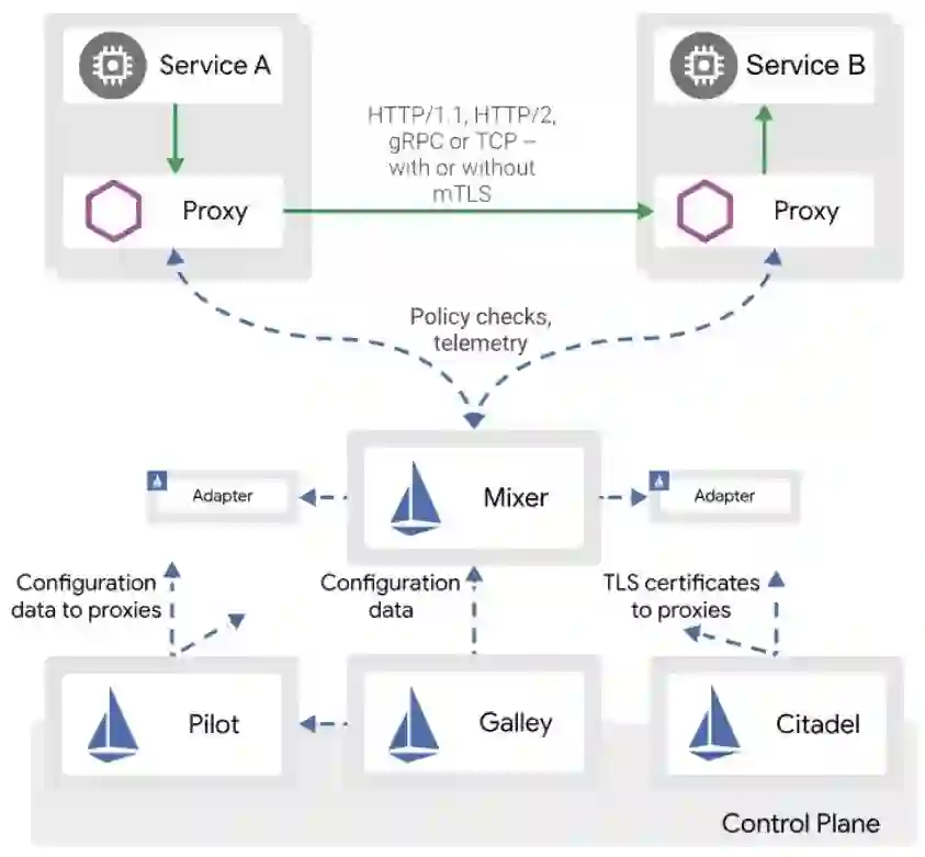 上图是Istio的架构,逻辑上分为数据平面和控制平面。数据平面由一组以 sidecar 方式部署的智能代理组成,负责截获应用网络流量,收集遥测数据并且执行服务治理策略。控制平面中,Galley负责配置管理,Pilot负责下发配置,Mixer负责策略检查和遥测数据聚合,Citadel负责通信中安全证书管理。