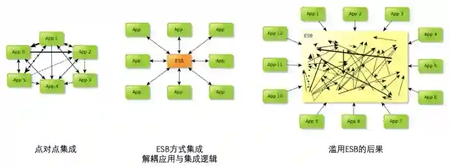 由于过度强调业务系统的可复用性,而不是对企业IT架构的治理和重构。大量服务集成的实现逻辑被下沉到ESB内部(如上图最右侧所示),这些逻辑非常难以维护,难以移植和扩展,成为ESB不可承受之重。我们必须在合适的地点合理地处理复杂性,而非将其简单转移。