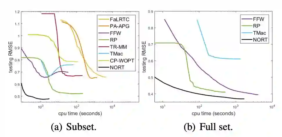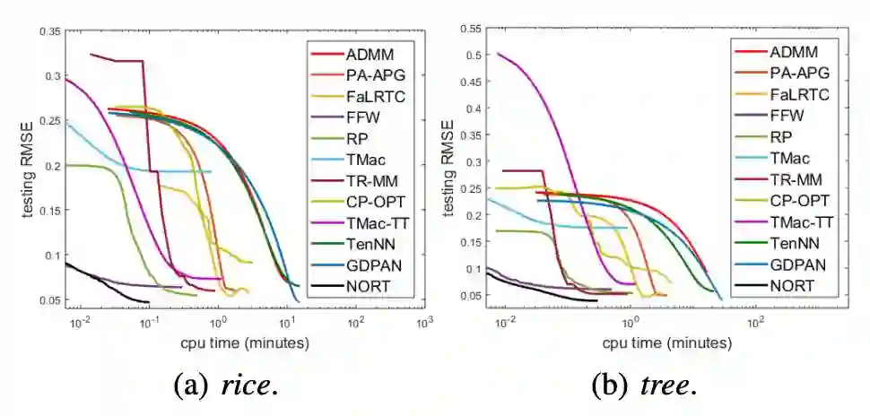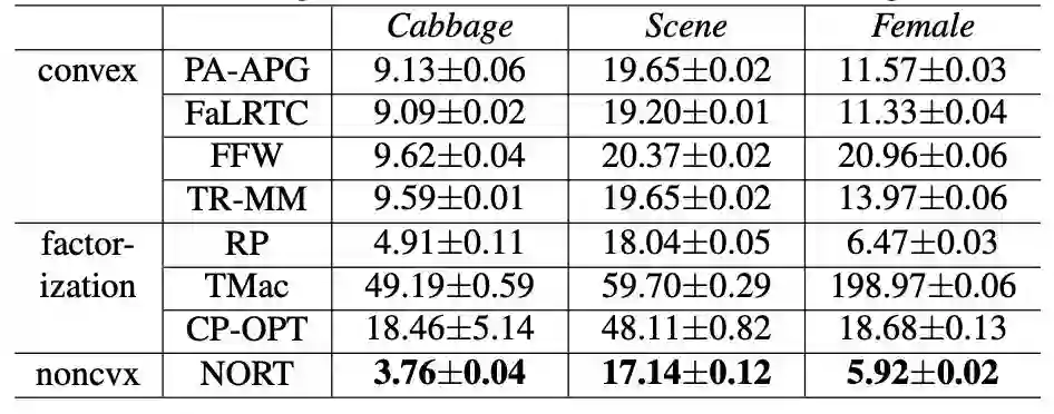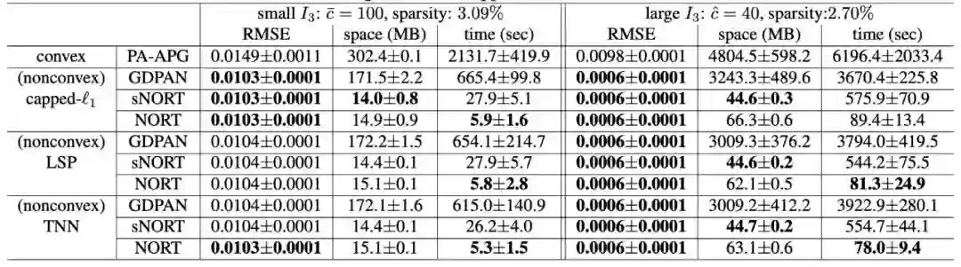 可以看到,PA-APG 的 RMSE 是最高的,这是由于凸约束项不如非凸约束项有效。不同的非凸惩罚项有着相似的 RMSE。对于空间需求,我们的方法 NORT 和 sNORT 是最小的,因为它们不需要在计算时构建稠密张量。而对于 CPU 时间,NORT 是最快的,sNORT 其次。这是因为 sNORT 利用了稀疏加低秩的结构,而 NORT 进一步使用了 adaptive momentum。
