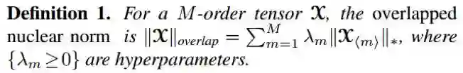 近年来,人们提出了许多基于矩阵核范数的凸近似约束项目来解决张量补全问题,包括用于张量的 trace norm、overlapped nuclear norm (Definition 1) 和 latent nuclear norm。特别是,overlapped nuclear norm 最受欢迎,因为它可以精确计算具有更好的低秩近似值,并精确的恢复。