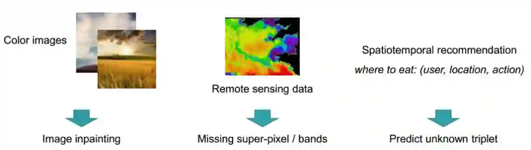 ▲ 图2. 张量补全的三种典型应用场景:彩色图像恢复,高光谱图像的处理和时空数据的预测