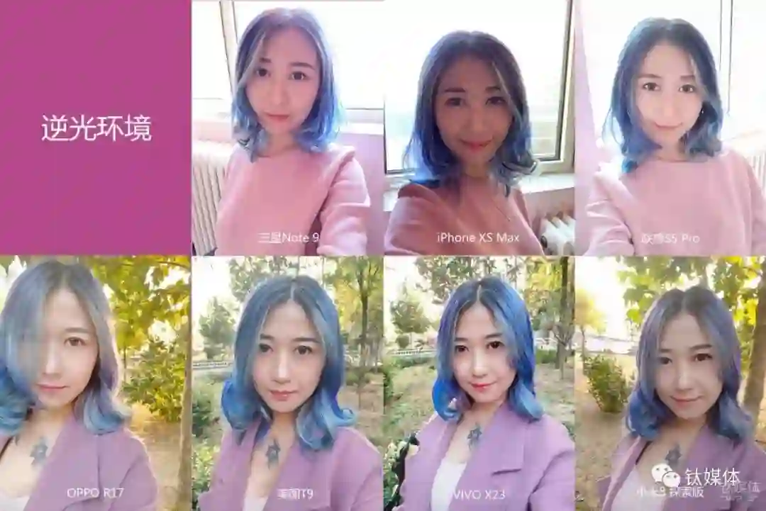 最后来看看逆光自拍,平时我们用手机逆光自拍的时候,可能会出现人脸比较黑,背景很亮的情况,如何解决这个难题,保证人脸曝光正确背景又能看的清楚则是美颜手机需要解决的问题。从对比图中我们可以看到这5款美颜手机的逆光自拍能力都比较不错,而作为参照物的两款手机,三星Note 9的表现可圈可点,而iPhone XS Max就过于“真实”了……