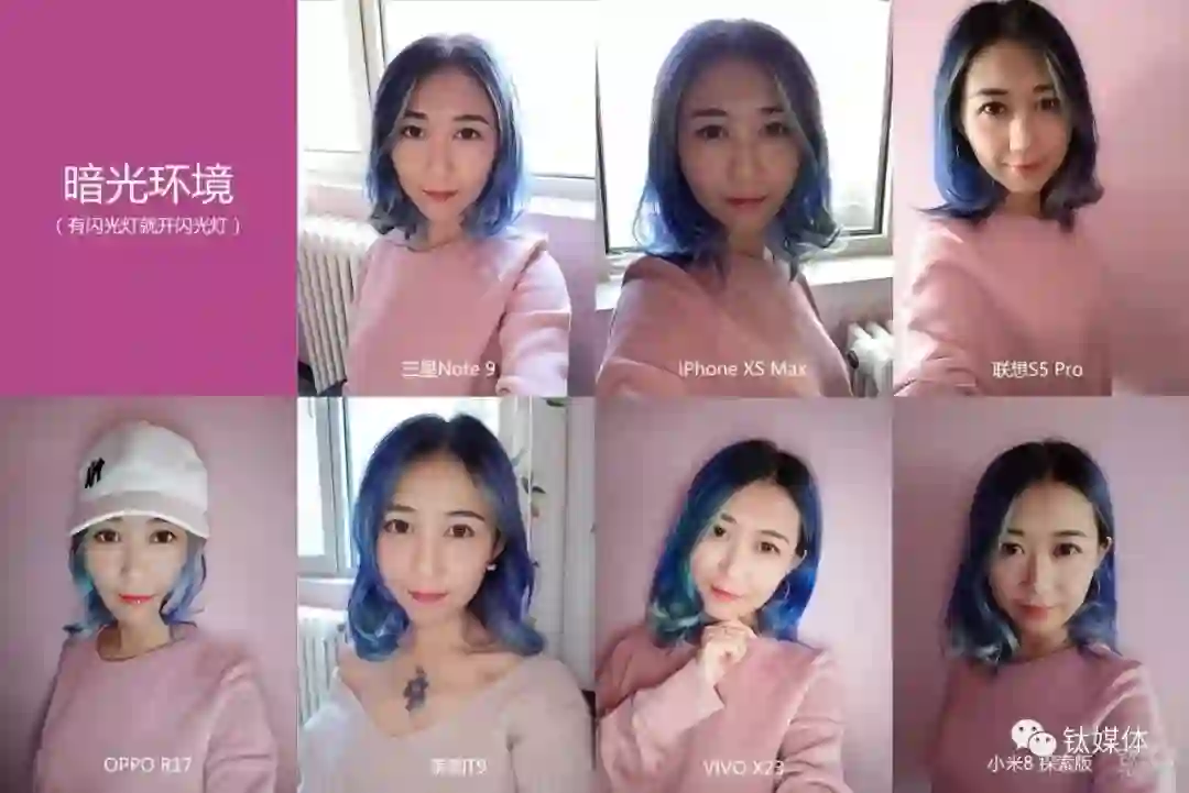 鉴于妹子们普遍对数码产品不感冒,而目前市面上绝大多数手机都号称自己有着神级自拍,所以钛妹选了比较火爆的5款美颜手机进行对比评测,它们分别是美图T9、OPPO R17、vivo X23、小米8探索版和联想S5 Pro,为了让读者有直观的比较感觉,我们还加入了目前iOS和安卓的两款旗舰机作为参照,它们分别是iPhone XS Max和三星Note 9。