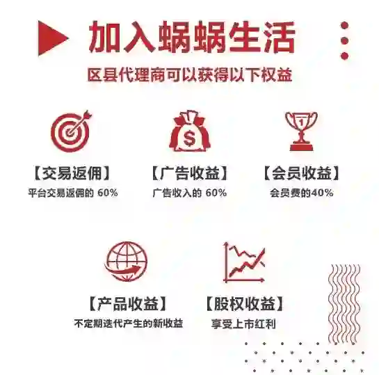 成为蜗蜗生活的合伙人,可以让你创业之梦照进现实,走向创富之路。成为蜗蜗生活合伙人后,总部将为其提供提供运营帮扶、明星代言、线上推广和物料支持,助力代理商实现“互联网+服务+共创”的梦想。