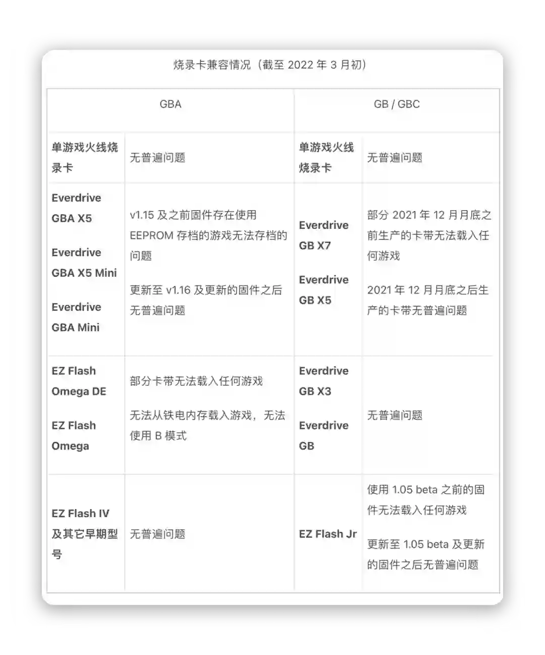 以 EZ Flash 和 Everdrive 为代表的后者价格昂贵、功能繁多,而且通过 SD 卡可以轻松存下整个 GB 时代的游戏,在今天已经成为了经典游戏玩家消费的主流。但是由于这些烧录卡的特点是每次加载游戏时需要从 SD 卡把游戏 ROM 加载到一个临时的内存芯片中,然后重新启动 BIOS,通过 FPGA 或类似技术模拟真实卡带,这多出来的一步在 Pocket 身上就成为了一个大问题。目前最高端的 GB/GBC 烧录卡 Everdrive GB X7 在 Pocket 上有将近一半的概率无法启动游戏,而功能最多的 GBA 烧录卡 EZ Flash Omega DE 在 Pocket 上则无法使用直接加载铁电内存中的游戏模拟成单游戏卡带的「B 模式」。