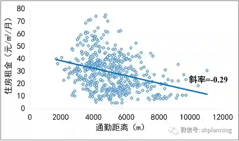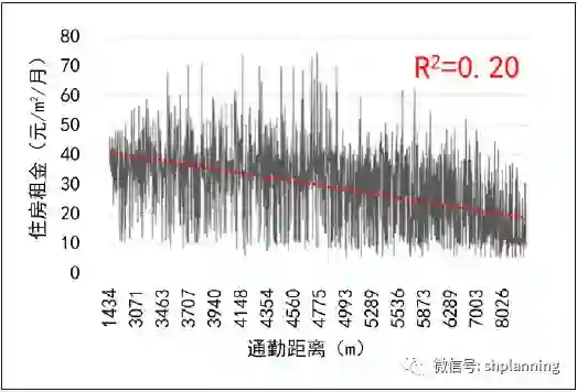 在传统竞租模型中,由于出行距离的影响,住房距就业中心越远,单位面积租金越低,这也与我们的常识相符。