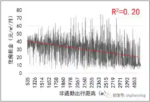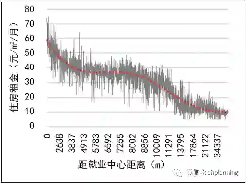 当以距就业中心的距离衡量区位时,发现距就业中心距离与住房租金空间分布的总体趋势接近,但没能反映出诸多城市形态因素的影响。