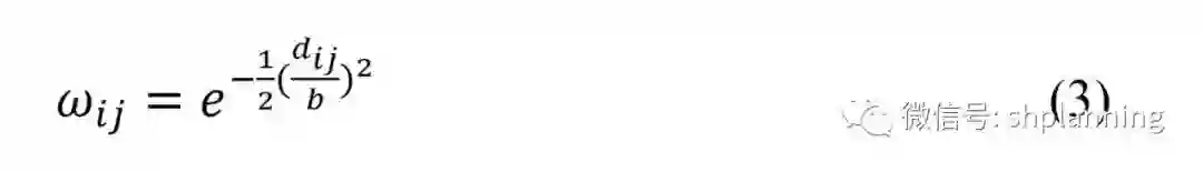 式(3)中,ωij为社区i和社区j之间的空间权重Gauss函数,b为GWR分析的带宽,dij是社区i和社区j之间的距离。