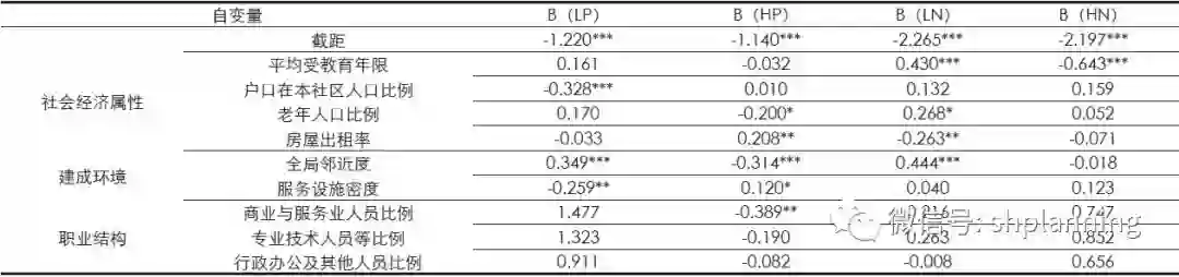 对本文的广州案例而言,多项logistic回归的结果显示,社区居民社会经济属性、居民职业结构、社区建成环境3类因素能显著地区分低通勤正显著(LP)、高通勤正显著(HP)、低通勤负显著(LN)和高通勤负显著(HN)4类社区。