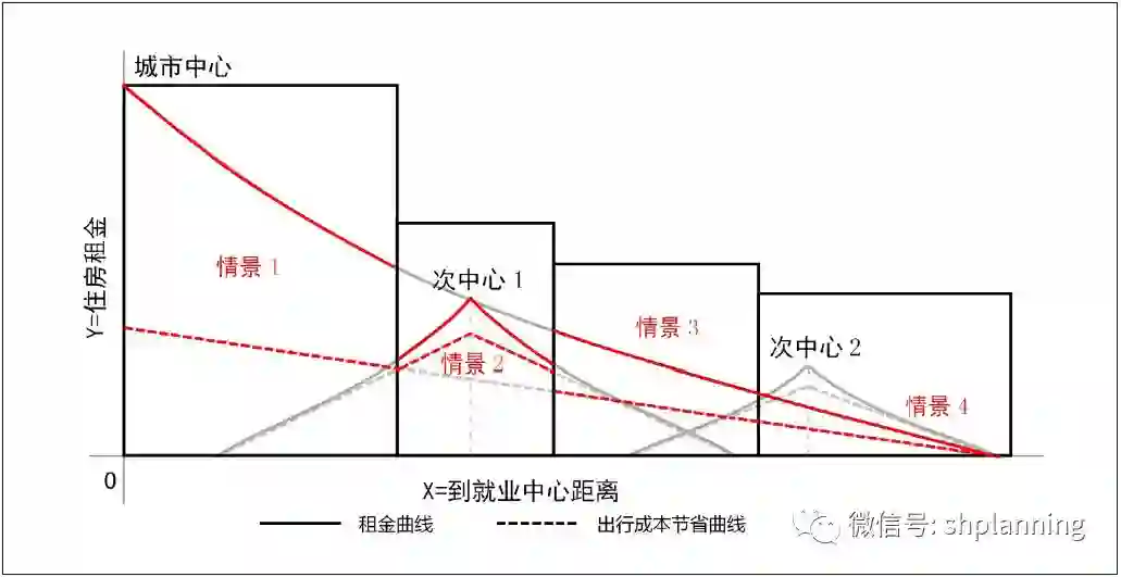 总体而言,在现代多中心城市,住房竞租模型的情景是多样的,在不同的情景组合下,出行距离与住房租金的关系将出现差异明显的空间分异。