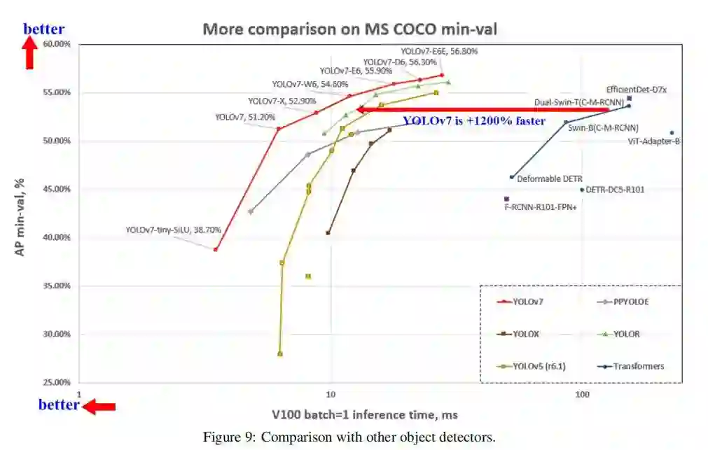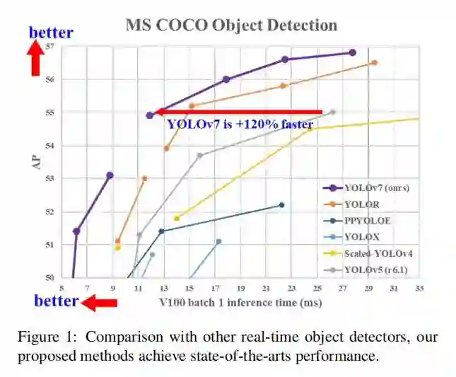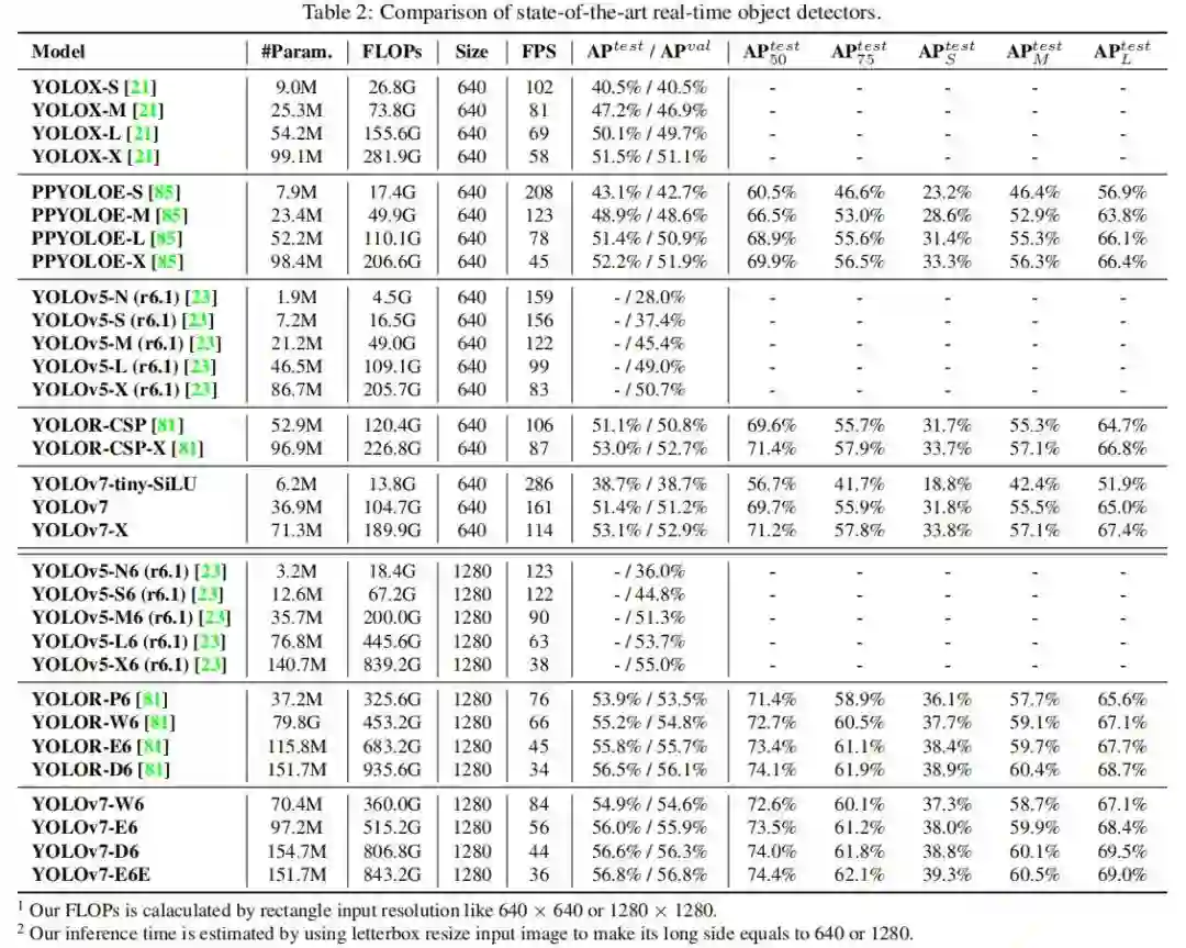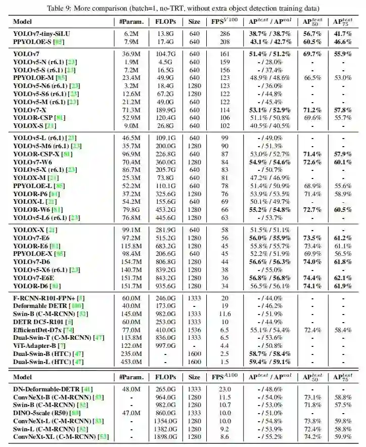 YOLOv4的团队昨天刚出炉的最新工作- YOLOv7,实验结果显示,YOLOv7基于Transformer的检测器 SWIN-L Cascade-Mask R-CNN的速度和准确度分别高出 509% 和 2%,并且比基于卷积的检测器 ConvNeXt-XL Cascade-Mask R-CNN速度提高 551%,准确率提高 0.7% >>加入极市CV技术交流群,走在计算机视觉的最前沿