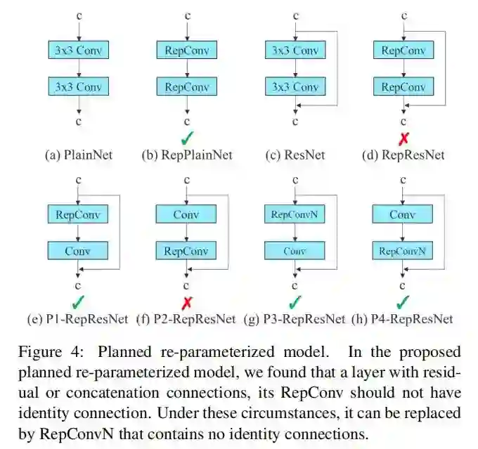 基于上述原因,作者使用没有id连接的RepConv(RepConvN)来设计计划中的重参数化卷积的体系结构。在作者的思维中,当具有残差或连接的卷积层被重新参数化的卷积所取代时,不应该存在id连接。图4显示了在PlainNet和ResNet中使用的“Planned re-parameterized convolution”的一个示例。对于基于残差的模型和基于concatenate的模型中Planned re-parameterized convolution实验,它将在消融研究环节中提出。