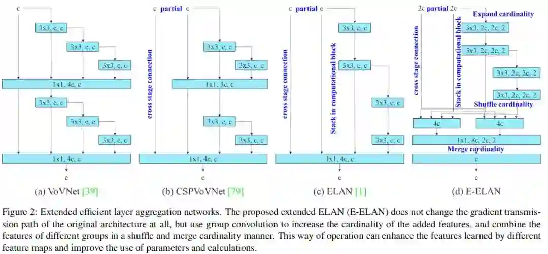在本文中,作者提出了基于 ELAN 的Extended-ELAN (E-ELAN),其主要架构如图 2(d)所示。