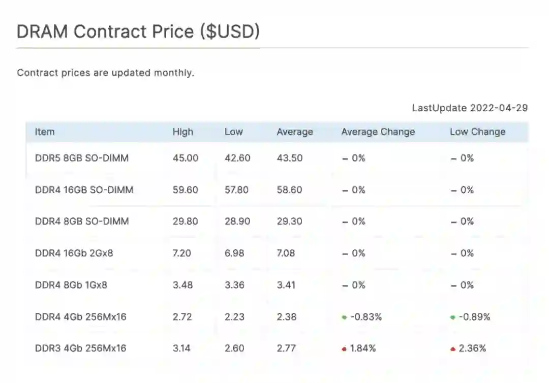 据TrendForce 数据分析,今年第二季度 DRAM 平均合同价较上年同期下降了 10.6%,是两年来第一次出现同比下降。这意味着由 COVID 带来的需求飙升、供应短缺和涨价开始缓和。另一种主要的内存类别,即提供内容存储功能的 NAND 闪存,在过去两年里价格波动。据预测,在今年第三季度 DRAM 平均合同价或将环比下跌 21%,NAND 的价格或将环比下跌 12%。近来,包括三星、美光在内的大型芯片企业已经陆续发布了低于预期的业绩预测。