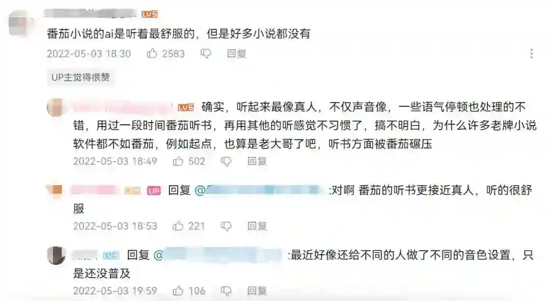 语音合成的 AI 虽然有些地方读法不对,但大多数时候都给人带来了很好的体验。在演示 bug 的视频下也有网友认为,番茄小说的文本朗读是同类 APP 里听起来最舒服的。