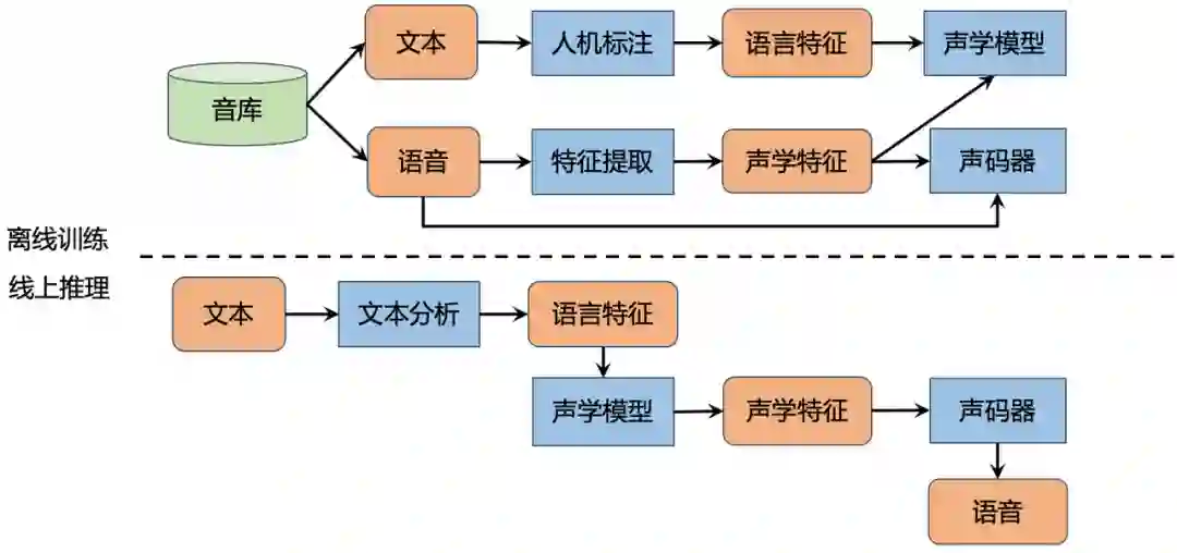 在人工智能领域里,语音技术是计算机视觉(CV)和自然语言理解(NLP)之外的另一个重要领域,最早的研究可以追溯到 1952 年。一个典型的语音合成系统(Text-to-Speech,TTS)通常分成三个标准技术模块:文本分析前端,中间的声学模型,和最后的声码器(vocoder)。