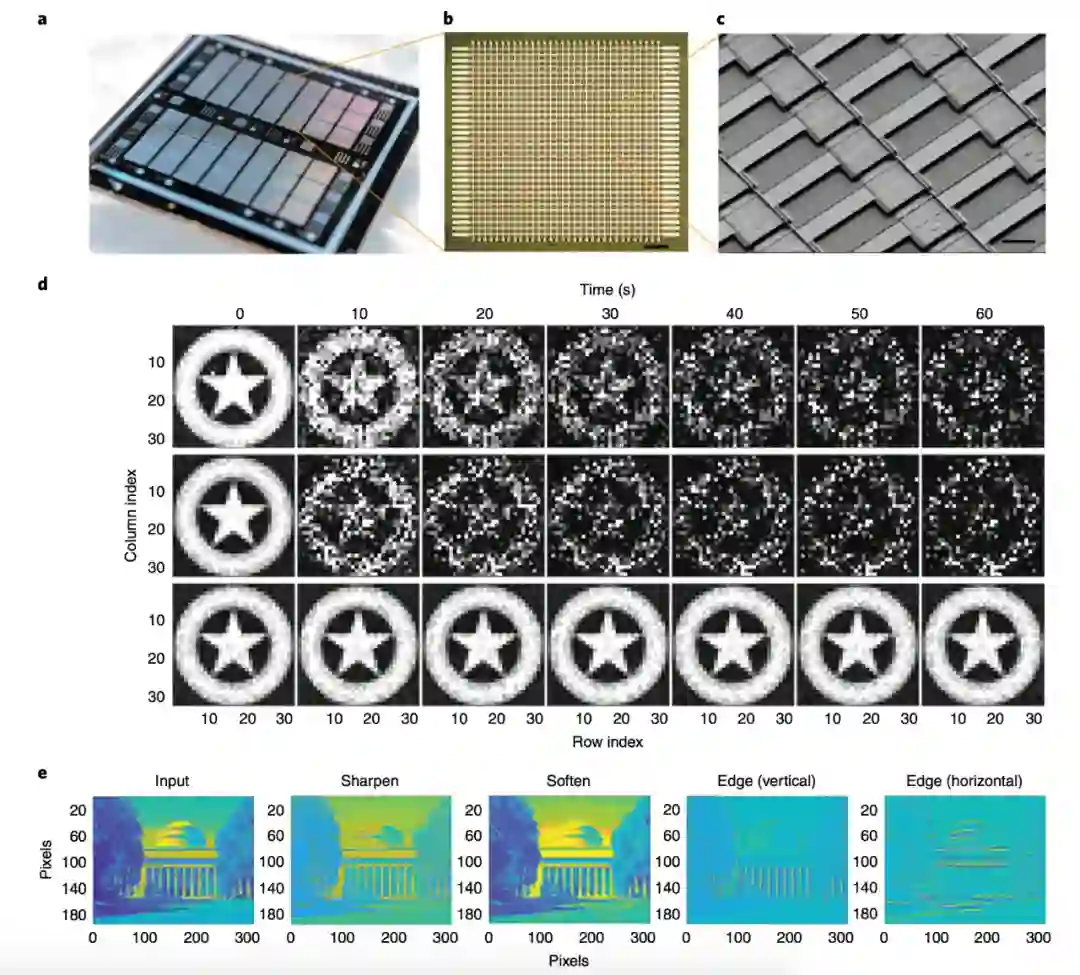 在芯片的第一次试验中,他们重新创造了美国队长盾牌的灰度图像。他们将图像中的每一个像素和芯片中的忆阻器相对应。然后,调节每个忆阻器的电导,其强度和图像中对应像素颜色有关。