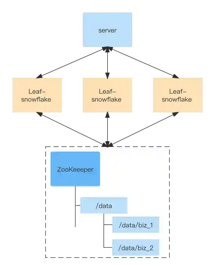 用Zookeeper顺序增、全局唯一的节点版本号,替换了原有的机器地址。解决了时钟回拨的问题。前面介绍ZooKeeper的缺点,强依赖ZooKeeper、大流量下的网络瓶颈。下图的方案在Leaf-snowflake 中通过缓存一个ZooKeeper文件夹,提高可用性。运行时运行时,时差小于5ms会等待时差两倍时间,如果时差大于5ms报警并停止启动。