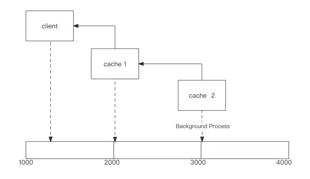 增强版是对上面描述的缺点2进行的改进——双cache。在leaf的ID消耗到一定百分比时,常驻的后台进程会预先去号段服务获取新的号段并缓存。具体消耗百分比、及号段step根据业务消耗速度来定。