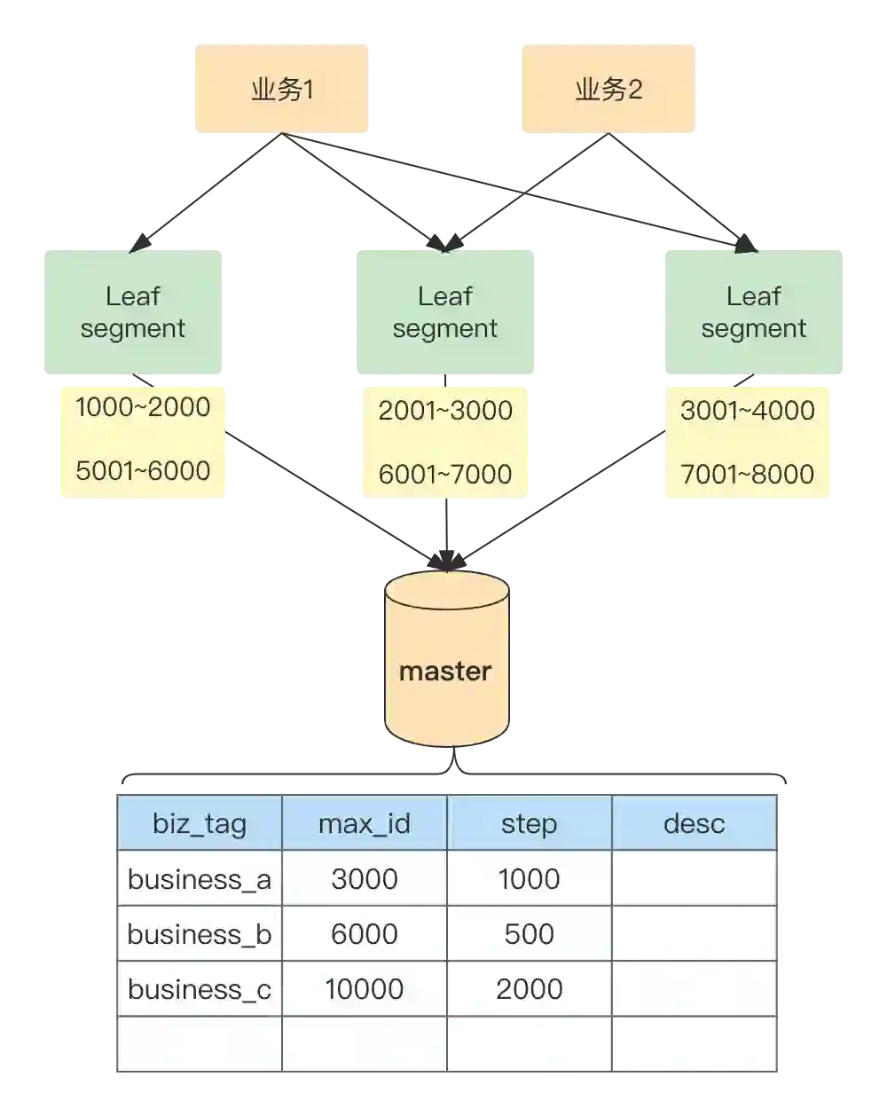 把数据库自增主键换成了计数法。每个业务分配一个biz_tag、并记录各业务最大id(max_id)、号段跨度(step)等数据。这样每次取号只需要更新biz_tag对应的max_id,就可以拿到step个id。