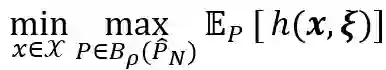 直观上可以认为该不确定集是以经验分布中心,半径为的一个球,球中包含了所有可能的概率分布。基于该不确定集,分布鲁棒优化问题此时可以建模成: