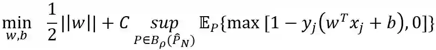 以机器学习中的经典分类器支持向量机(SVM)为例,认为训练样本具有不确定性且服从某一未知分布,考虑以下基于Wasserstein不确定集的分布鲁棒优化SVM问题: