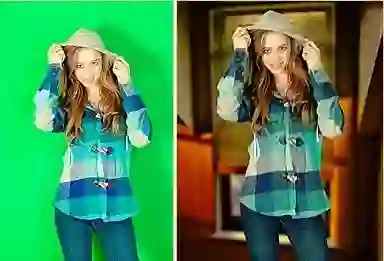 下图是色键技术的一个示例:在绿幕前穿着蓝色衣服的小姐姐,左图为去背前,右图为去背后的新背景。
