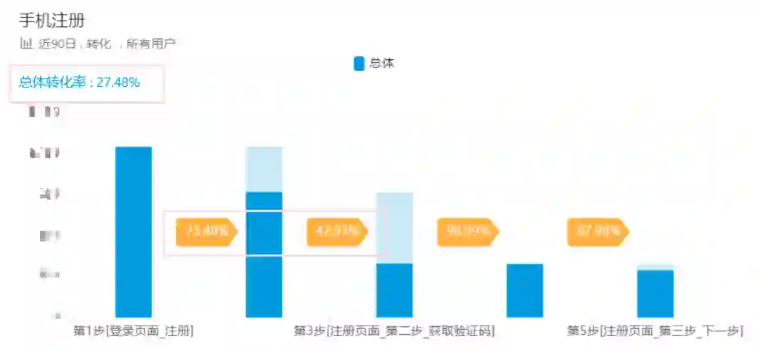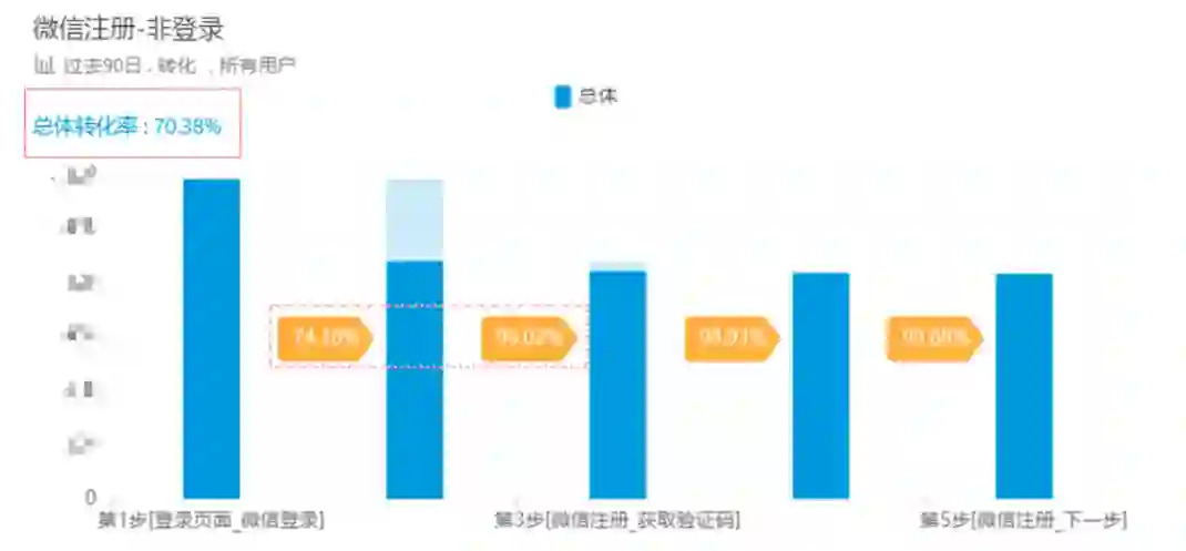 通过漏斗分析发现用户流失主要路径。用户从浏览注册、绑定到持续活跃到最后流失,其实就是一个完整的用户生命旅程。该企业的问题是线下用户难以转化为线上用户,注册是最核心指标,通过漏斗分析发现用户流失触点,取消注册流程中的非重要信息,简化用户上手门槛,改为手机验证码登录。