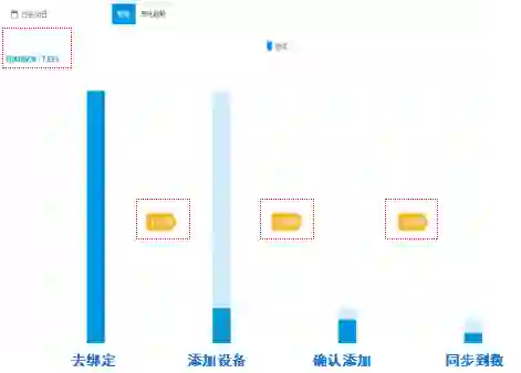 智能硬件领域,从线下到线上,注册量是一个重要业务指标,设备绑定又是另一个门槛。只有用户成功完成绑定,才能实现线上线下数据打通。企业A的App成功绑定设备的总体的转化率仅为7.53%,点击同步到添加设备的转化率仅为17.71%,确认添加和同步到数据的转化率分别为73.68%和59.52%。