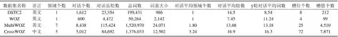 其中,CrossWOZ 是中文任务型对话数据集,DSTC2和WOZ 是单领域任务型数据集。