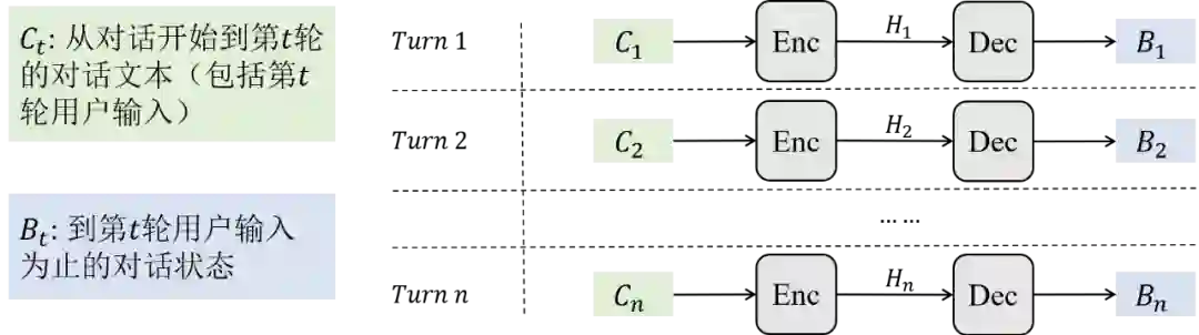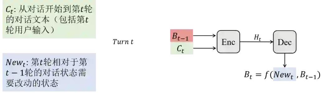 我们将这类方法称为递进方案,如图9所示,递进方案将每一轮的对话状态看作一种明确的数据结构,在生成当前轮的对话状态时不光可以看到对话历史,还可以利用之前轮已生成的对话状态。该类方法可以根据当前轮对话对之前轮的对话状态进行更新,从而更快速地完成对话状态的生成。