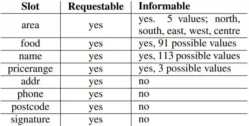 在对话中,用户通过指定约束条件寻找合适的餐厅,也可能要求系统提供某些槽位(如餐厅的电话号码)的信息。数据集提供了一个本体(ontology),其中详细地描述了所有可能的对话状态。具体来说, 中列出了用户可以询问的属性,被叫做可请求槽位(requestable slot),比如餐厅提供的菜品类型或者餐厅的电话号码。它也列出了可以被用户提出作为约束条件的属性及其可能的取值,这些属性被叫做可通知槽位(informable slot)。图2展示了DSTC2中的 的细节。因此,某个对话轮的对话状态被定义为三个部分: