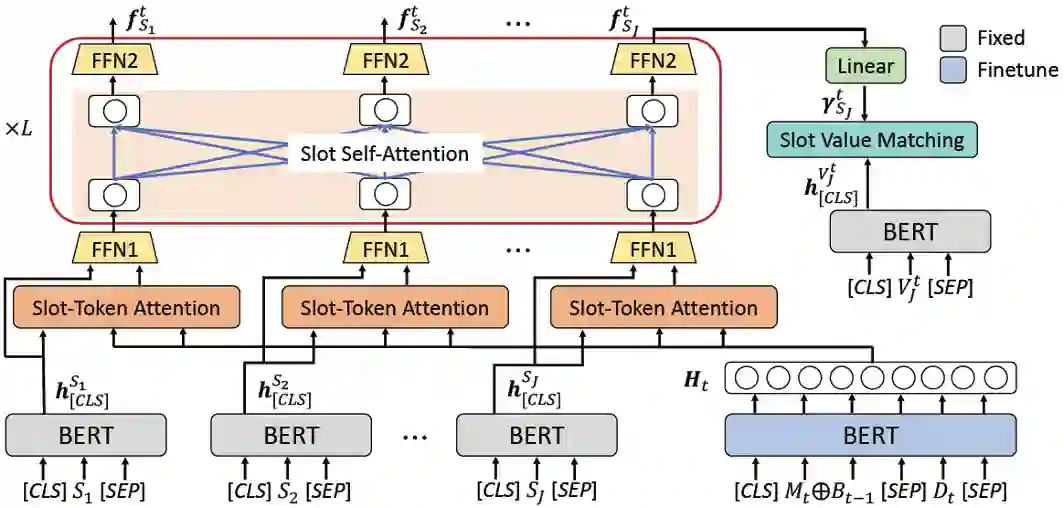 令 表示一个 轮对话, 和 分别表示对话第 轮的系统回复和用户话语。假设我们有 个 预定义的槽位 ,那么对话第 轮的对话状态被定义为 。其中, 表示槽位 的相应槽值, 是槽位 的取值空间。把所有槽位的取值空间放在一起,可以构建出一个本体 。