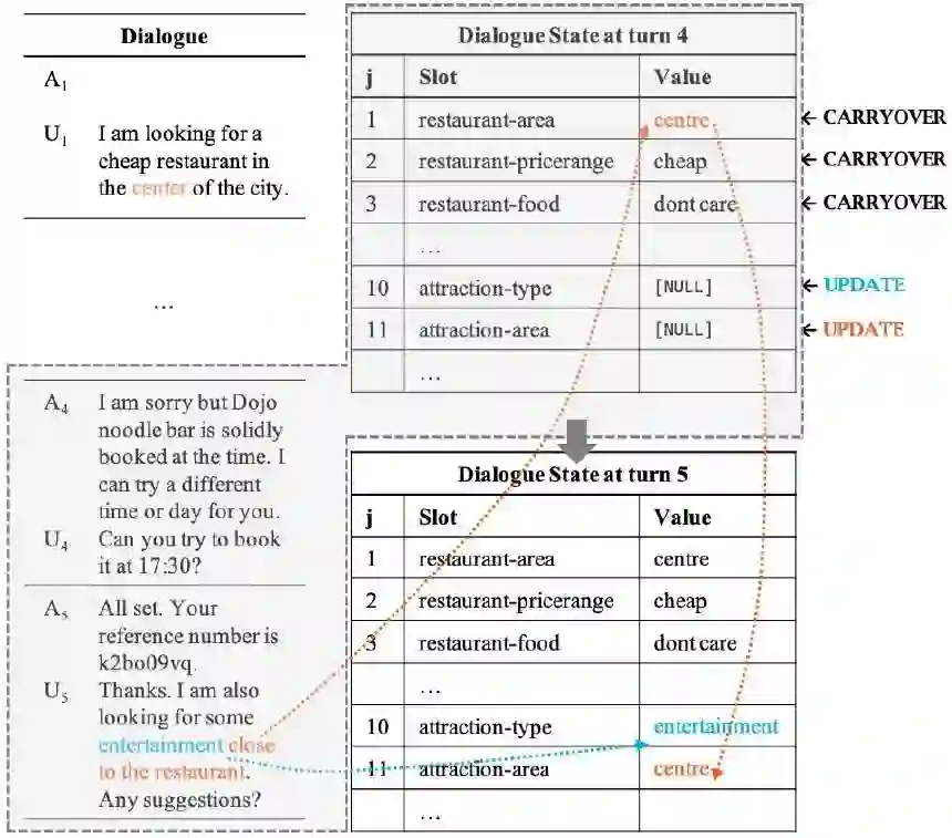 值得注意的是,我们使用“槽位”这个术语表示领域名称和槽位名称的组合,从而包含领域和槽位信息。例如,我们使用餐厅-价格范围而不是价格范围,去表示餐厅领域的价格范围槽位。当对话包含多个领域时,这种格式非常有用,它也被许多之前的研究工作广泛采纳。