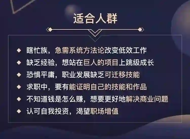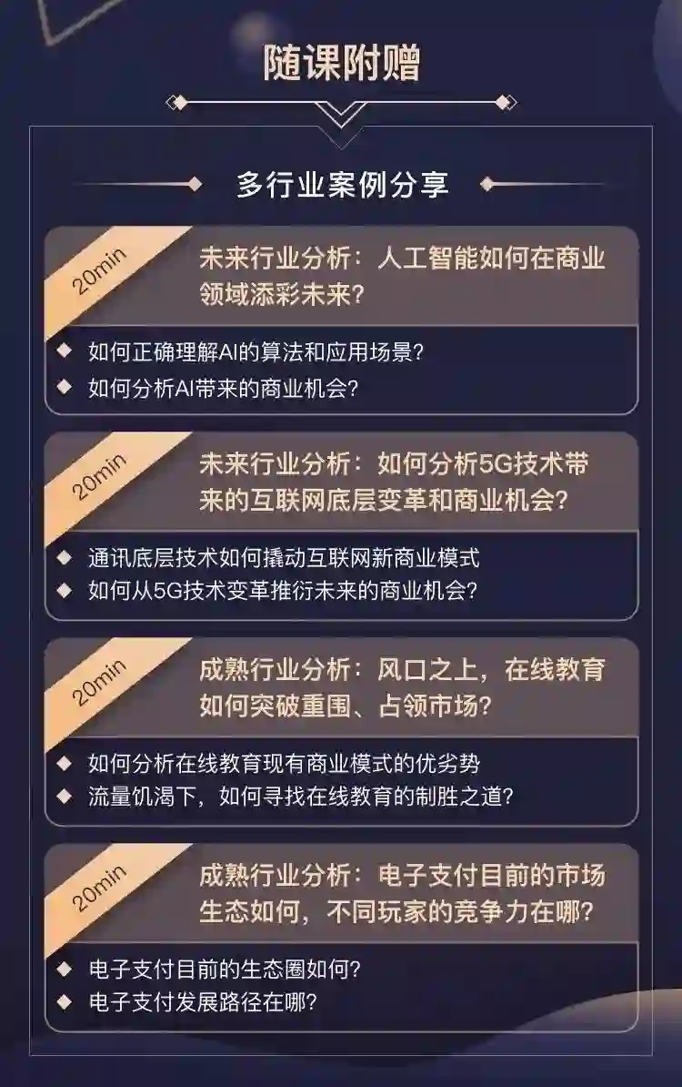 本课程有7大模块,含20节录播课程,3节直播答疑课程,课程总时长23+小时,同时随课赠送3个热门行业案例分享。