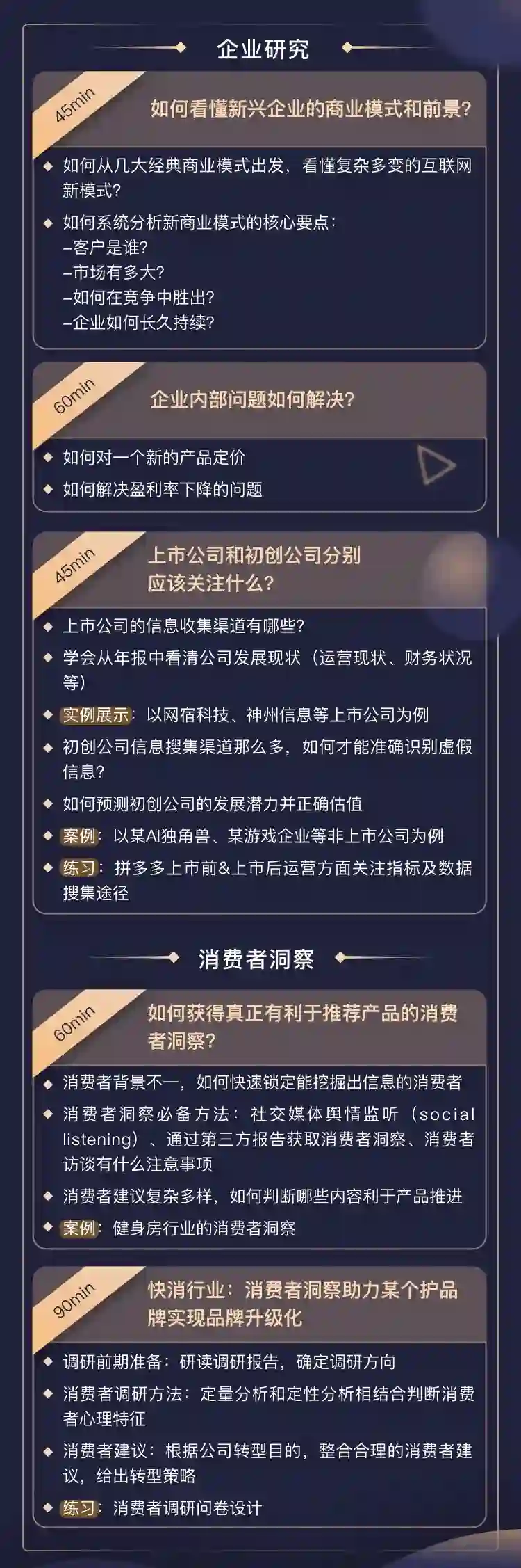 课程设计逻辑是「一个商业问题的界定-分析-汇报」,完整涵盖顶级商业分析师的工作流程,既有数据搜集、行业研究、企业研究、消费者研究,也有Excel数据分析,PPT制作。