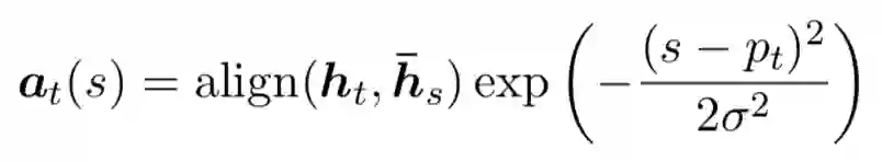其中 pt 是一个 source position index,可以理解为 attention 的“焦点”,作为模型的参数, D 根据经验来选择(文章选用 10)。 关于 pt 的计算,文章给出了两种计算方案:
