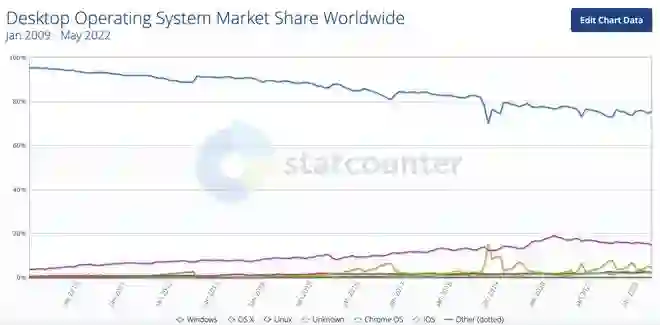 众所周知,微软 Windows 是全球桌面操作系统市场上的领头羊。虽然在最近几年,由于 macOS 和开源操作系统的影响,从 2009 年到 2022 年,Windows 的市场占有率在不断下降,但 Windows 系统在 2022 年 5 月依然占有 75.54% 的全球市场份额。