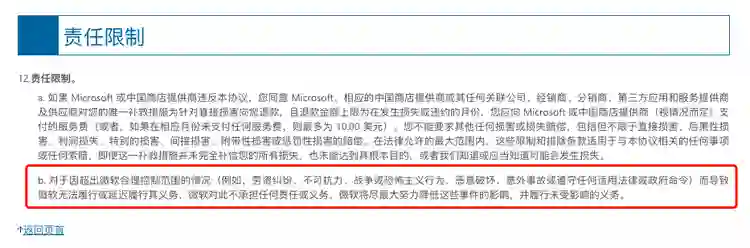 微软似乎早已为断供中国做好了准备。微软于 2020 年 8 月 1 日更新了服务协议,其中责任限制条款的 b 条内容指出: