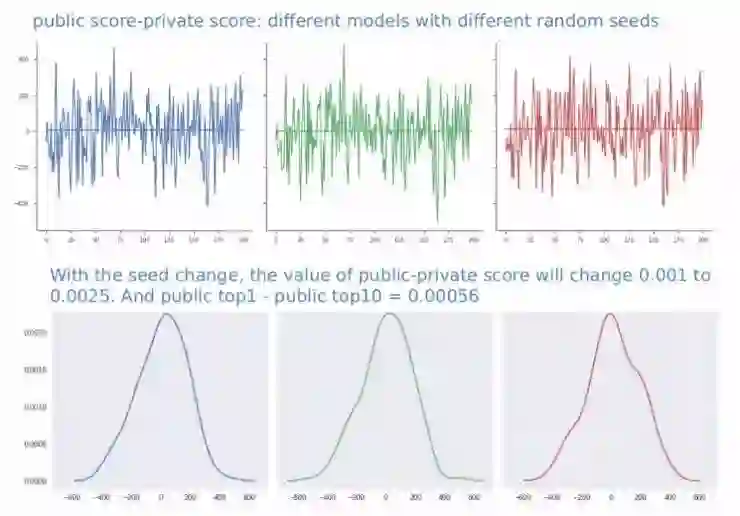 我发现随着种子的改变,我模拟的公共排行榜分数和私人排行榜分数之间的差距可能会扩大到0.0025。但在公共排行榜上,第一名和第十名的差距比这一数值要小。