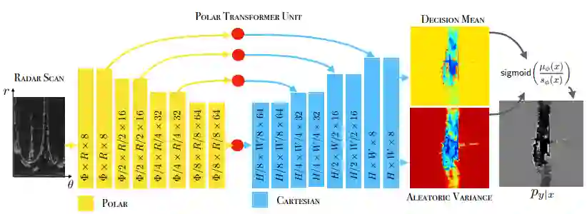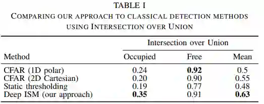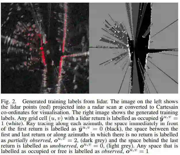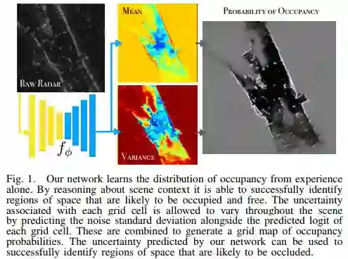 为了解决这个问题,我们提出了学习逆向传感器模型(ISM),使用深度神经网络将原始雷达扫描转换为占用概率栅格地图。我们的网络使用激光雷达生成的部分占用标签进行自我监督,它允许机器人从过去的经验中学习世界的占用情况,而无需人工监督。我们通过在动态城市环境中记录的五小时的数据来评估我们的方法。通过考虑每个栅格单元的场景上下文,我们的模型优于标准的CFAR滤波方法,能够成功地将世界划分为占用的和空闲的空间。此外,通过将异方差不确定性纳入我们的模型公式,我们能够量化整个传感器观察中不确定性的方差。通过这种机制,我们能够成功地识别可能被遮挡的空间区域。