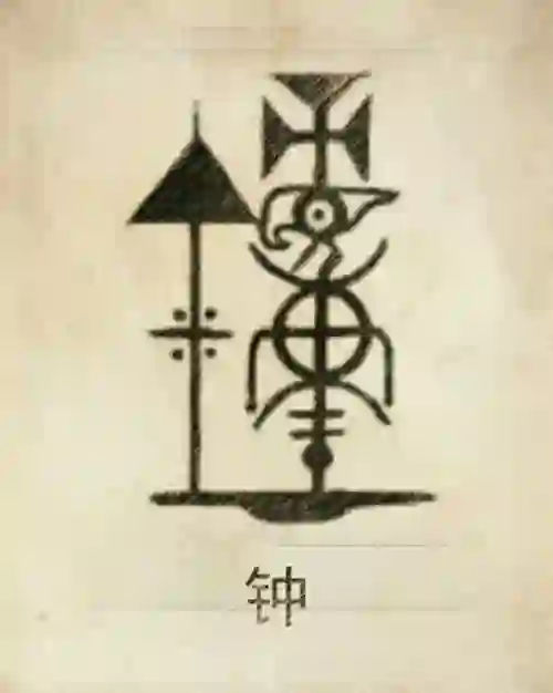 钟姓图腾,锺是由“俞表”和“重仪”合成。左边为俞表,是用来确定方向的。右边的“重仪”由“辛”、“东”、“目”、“土”组成。