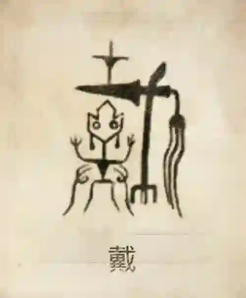 兵主蚩尤的祖先像为戴。戴由两部分组成,外面的“戈”代表兵器,即兵戈,为兵主战神的象征,下面是蚩尤的图腾像。下面的两只手表示供奉。